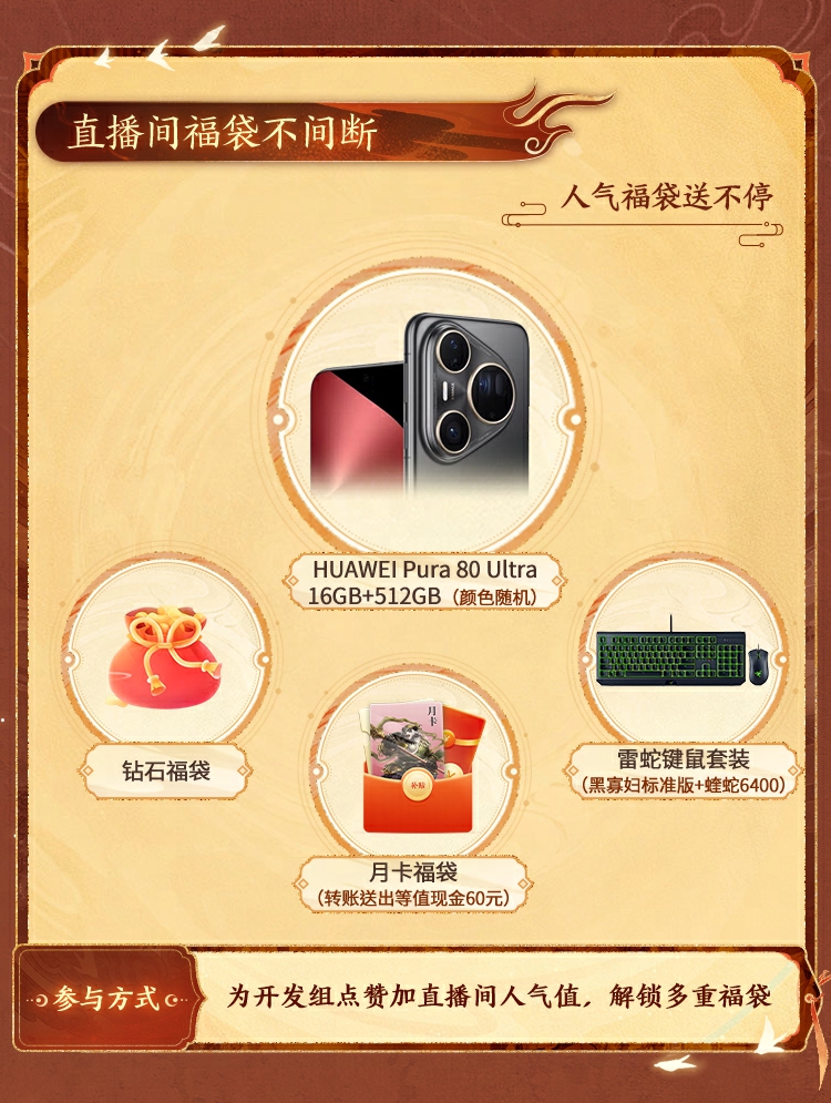 当然,除心愿好礼外,开发组更额外挑选了华为Pura80 Ultra、雷蛇键鼠套装、月卡、钻石福袋等礼品,大家记得提前把直播预告分享给身边的兄弟,一起来为直播间点赞,多多评论互动,人气越高,福利更丰厚!