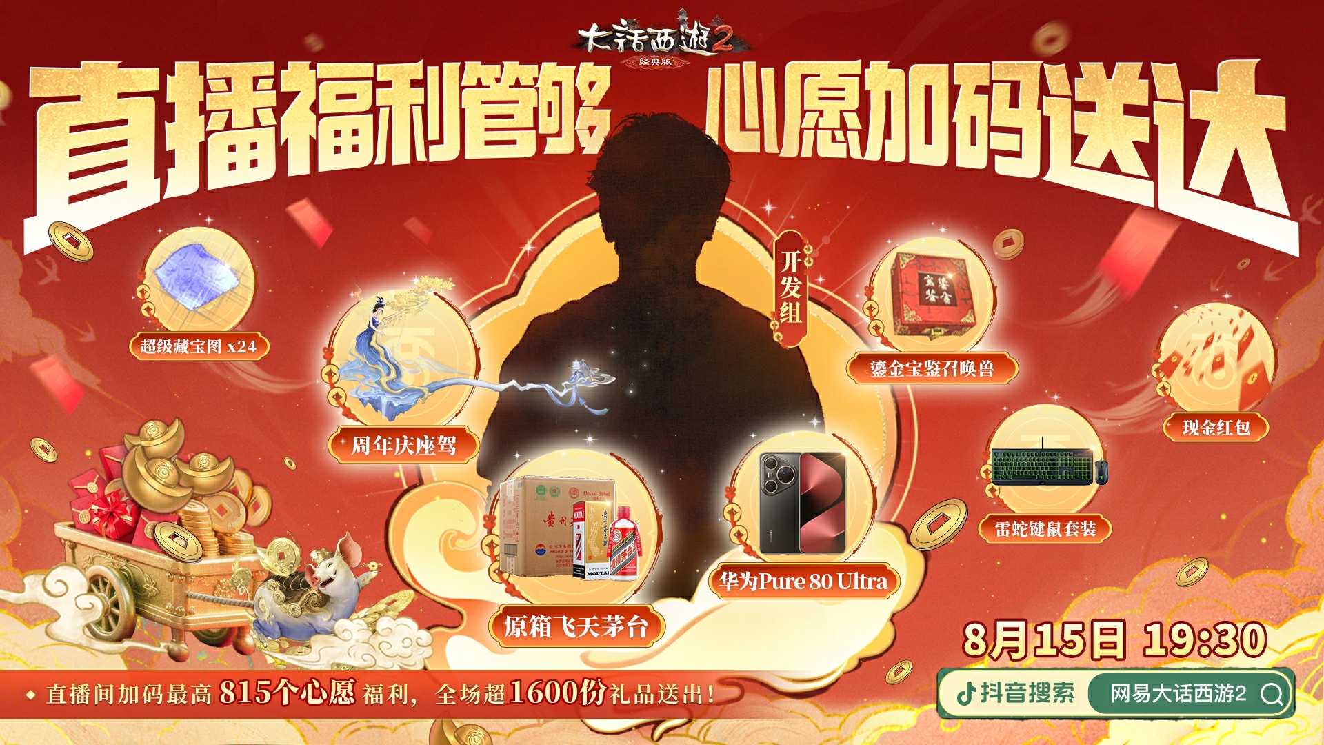 各位少侠只需在8月15日19:30准时锁定【网易大话西游2】抖音官方直播间,第一时间参与弹幕互动,就将有机会被选中获得上述福利,一定要准时观看直播哦!