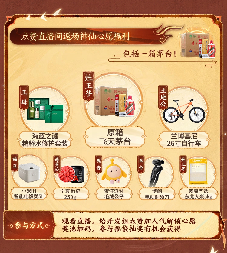 开发组已在八大神仙奖池中特别挑选了8种心愿好礼,将随着直播间人气升高为大家陆续送出!观看直播人数越多,少侠们双击点赞越热情,福利将解锁得越快、越多,最高将送出815份心愿好礼,其中包括有原箱飞天茅台、兰博基尼26寸自行车、海蓝之谜精粹水修护套装等人气心愿礼品!