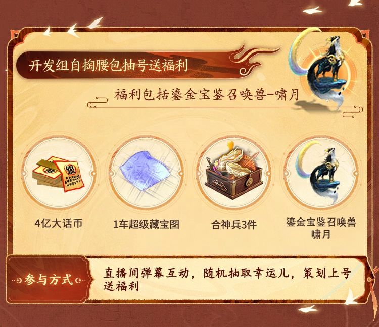 为了回馈各位少侠长期以来的陪伴与支持,也让更多江湖老友在看到直播后还有更多机会“实现心愿”,开发组将在直播间送出以下两大额外福利!