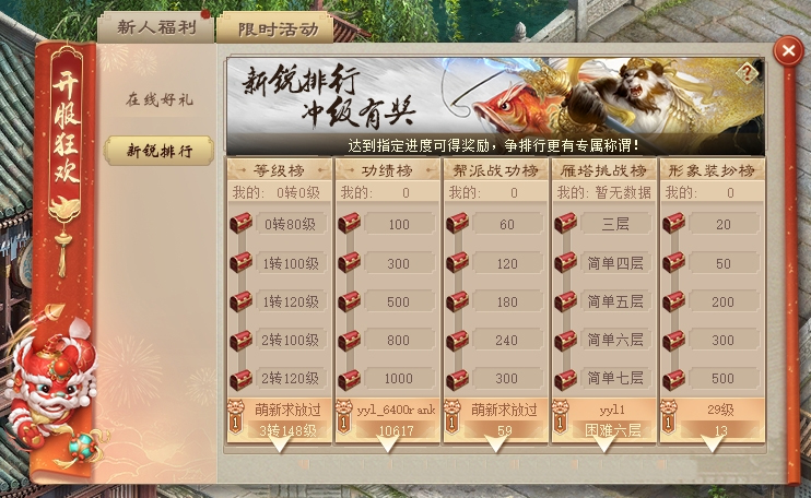 新服开启前24天开启“新锐排行”,分为等级、功绩、帮派战功、雁塔除妖、形象装扮五类,包含限定称谓、神兵、仙器、六魂之玉、神兵石、龙之骨、筋骨提气丸、终极修炼丹等奖励。