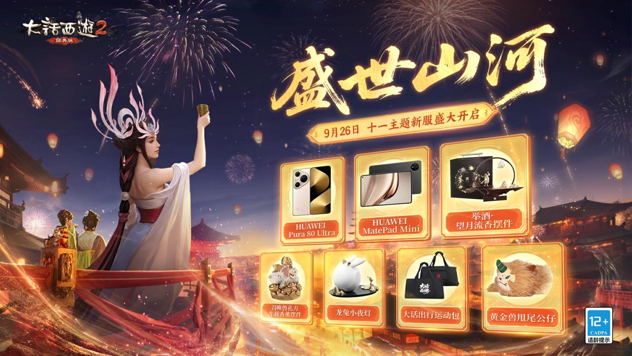 少侠参与十一主题新服【盛世山河】开服活动,还有机会获得华为Pura 80 Ultra 16GB+1TB 、华为MatePad Mini 12GB+256GB、举酒·望月流香摆件等好礼!