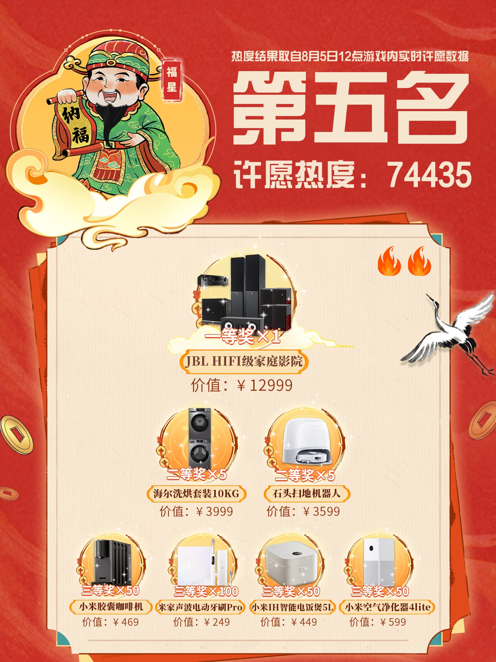 八仙齐送福,心愿大满足!这里也教大家一个小妙招,由于每位神仙的热度不同,奖品数量也分多少,所以建议大家瞄准低热度、高份量的仙官,巧用“返还重选”机制灵活调整,定能提升获奖几率!