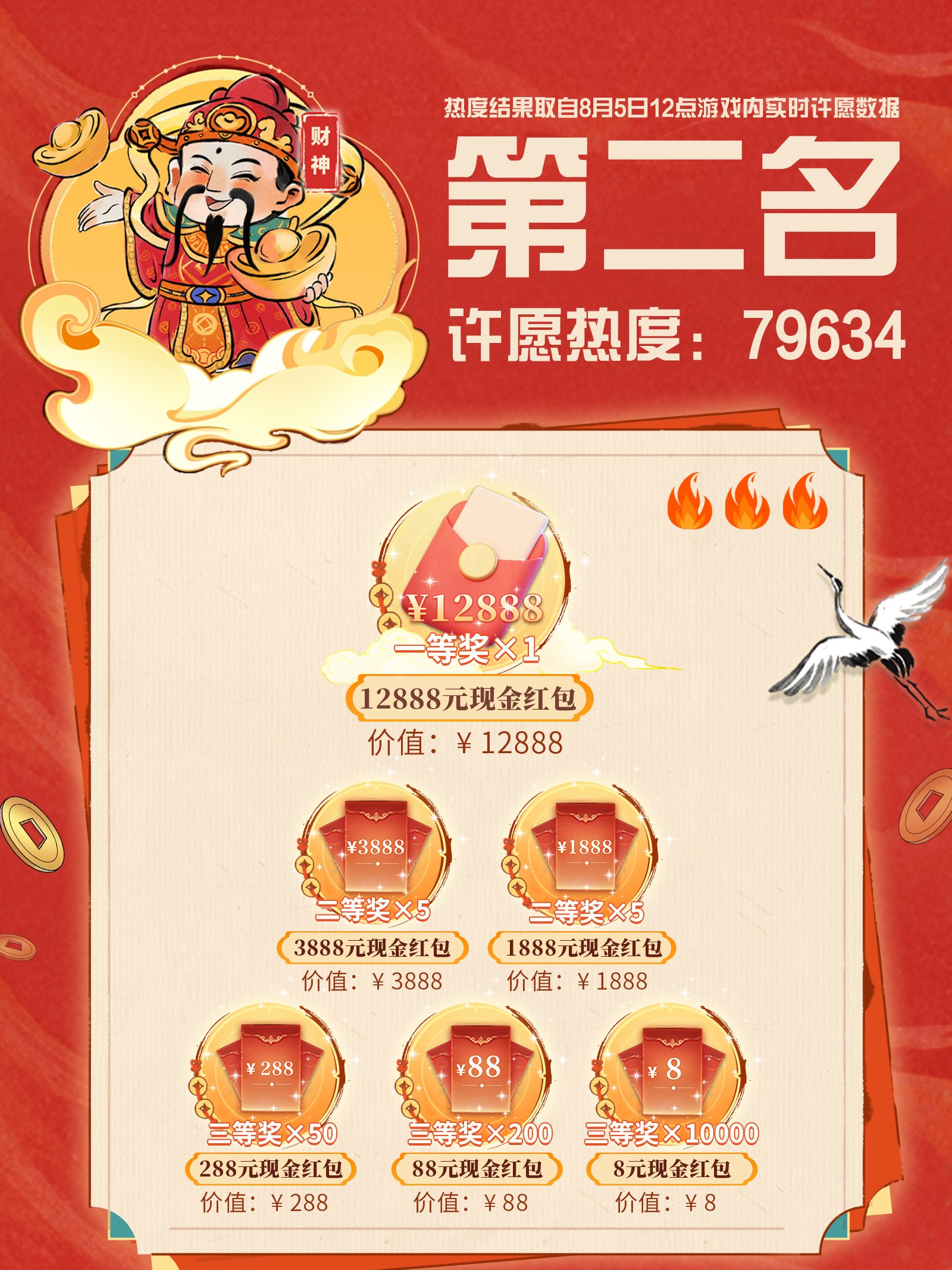 而财神嘛,当然要安排真金白银!8元现金、88元现金、288元现金、1888元现金、3888元现金、12888元现金红包大手笔派送,难怪少侠们都爱他!