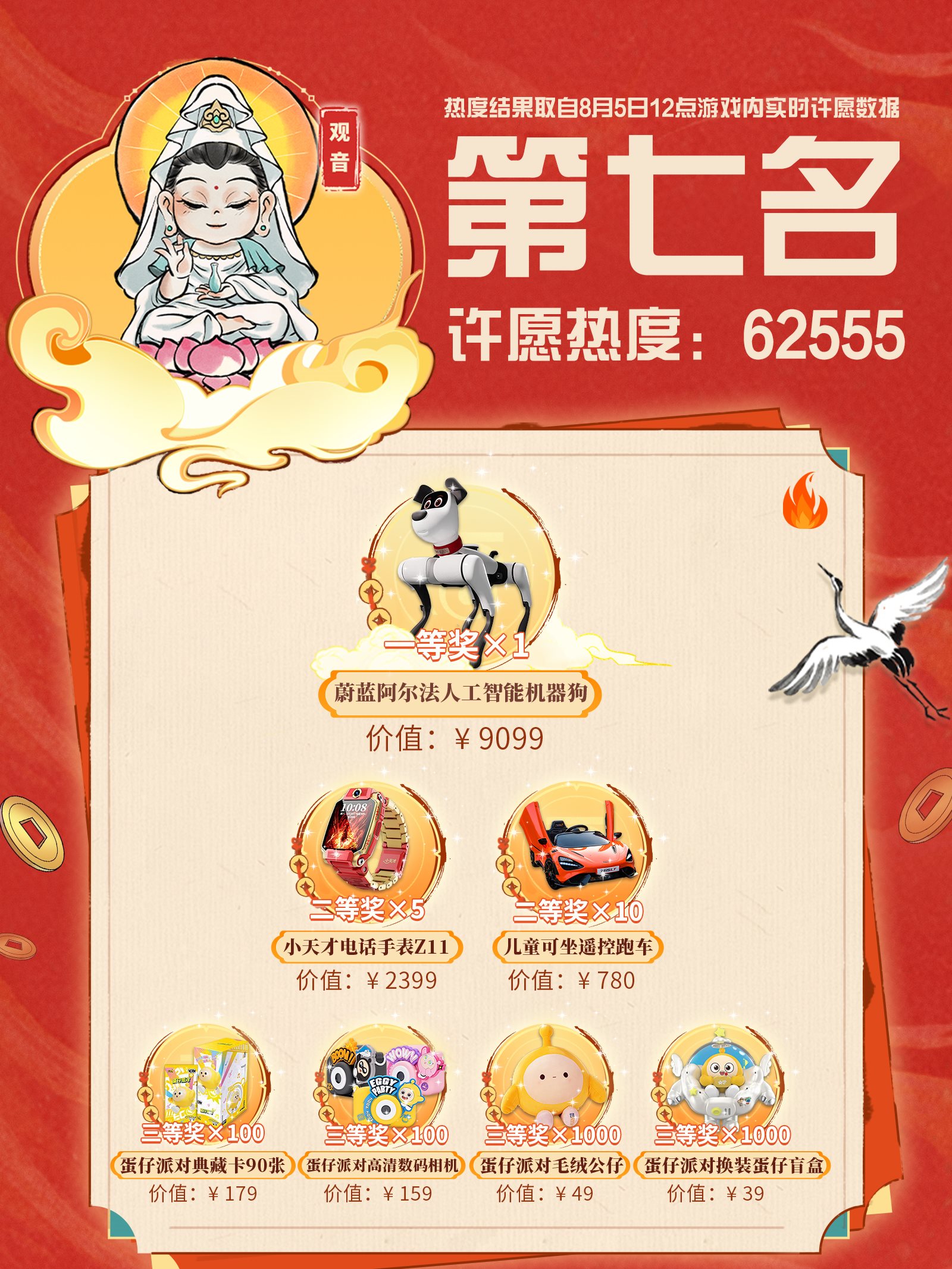 观音姐姐也送上了蔚蓝阿尔法人工智能机器狗、小天才电话手表Z11(哪吒定制款)、儿童可坐遥控跑车、蛋仔派对典藏卡90张、蛋仔派对高清数码相机、蛋仔派对毛绒公仔随机款等童心玩物!