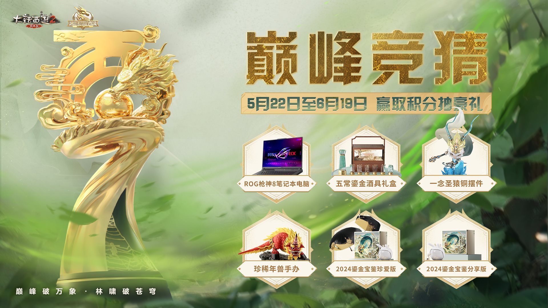 巅峰竞猜玩法已随赛程同步开启,参与就有机会赢得ROG枪神8笔记本电脑、2024鎏金宝鉴珍爱版、2024鎏金宝鉴分享版、五常鎏金酒具礼盒、一念圣猿铜摆件等实物好礼!