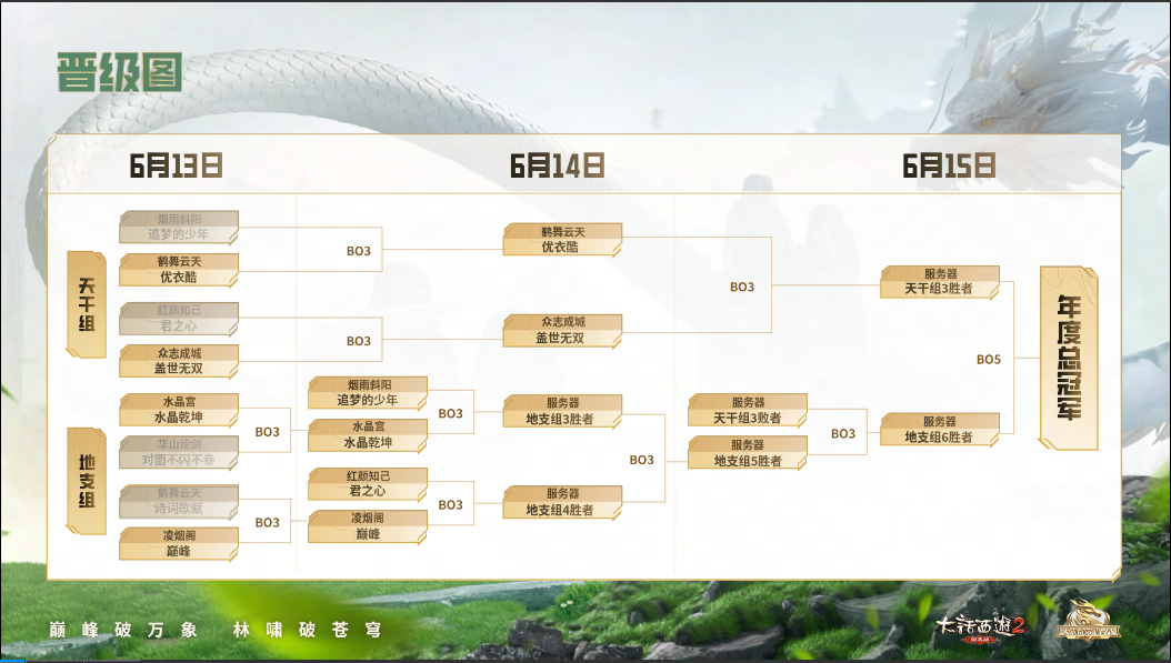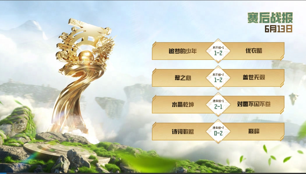 在地支组的比拼当中,水晶宫服务器“水晶乾坤”战队、凌烟阁服务器“巅峰”战队分别战胜对手获得晋级。而落败的华山论剑服务器“对面不闪不卷”战队、鹤舞云天服务器“诗词歌赋”战队则位列本届大赛八强。