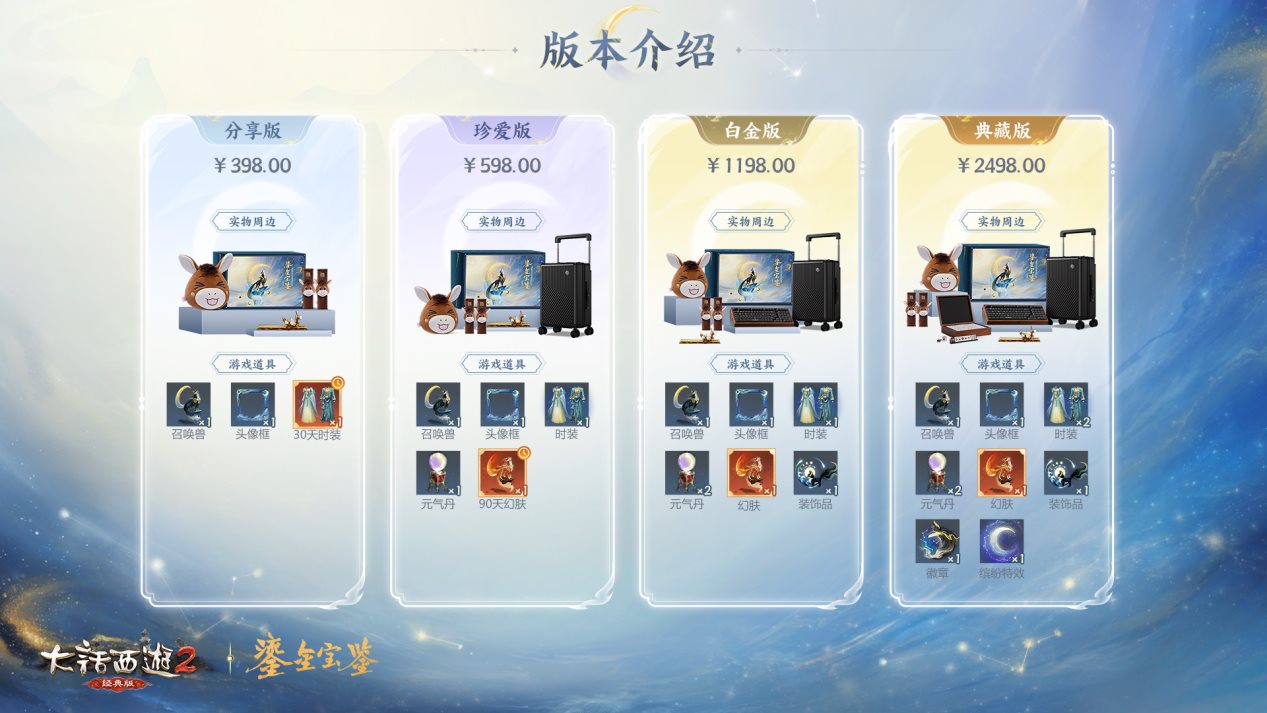 典藏版 | - | 2498 | 鸡驴车载三件套 大话畅游行李箱 大话实木机械键盘 大话好运麻将 | 召唤兽*1 元气丹*2 头像框*1 永久时装*2 装饰品*1 徽章*1 缤纷特效*1 啸月专属幻肤(永久) |