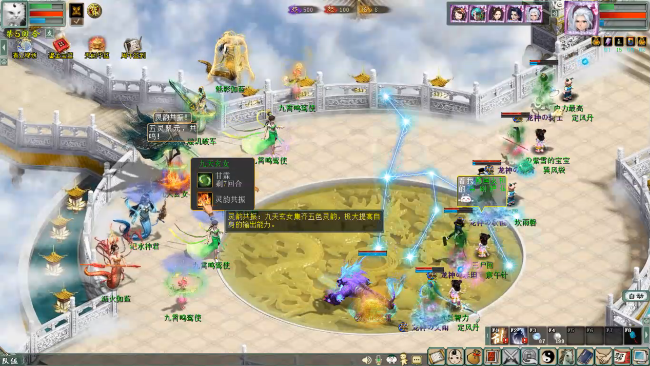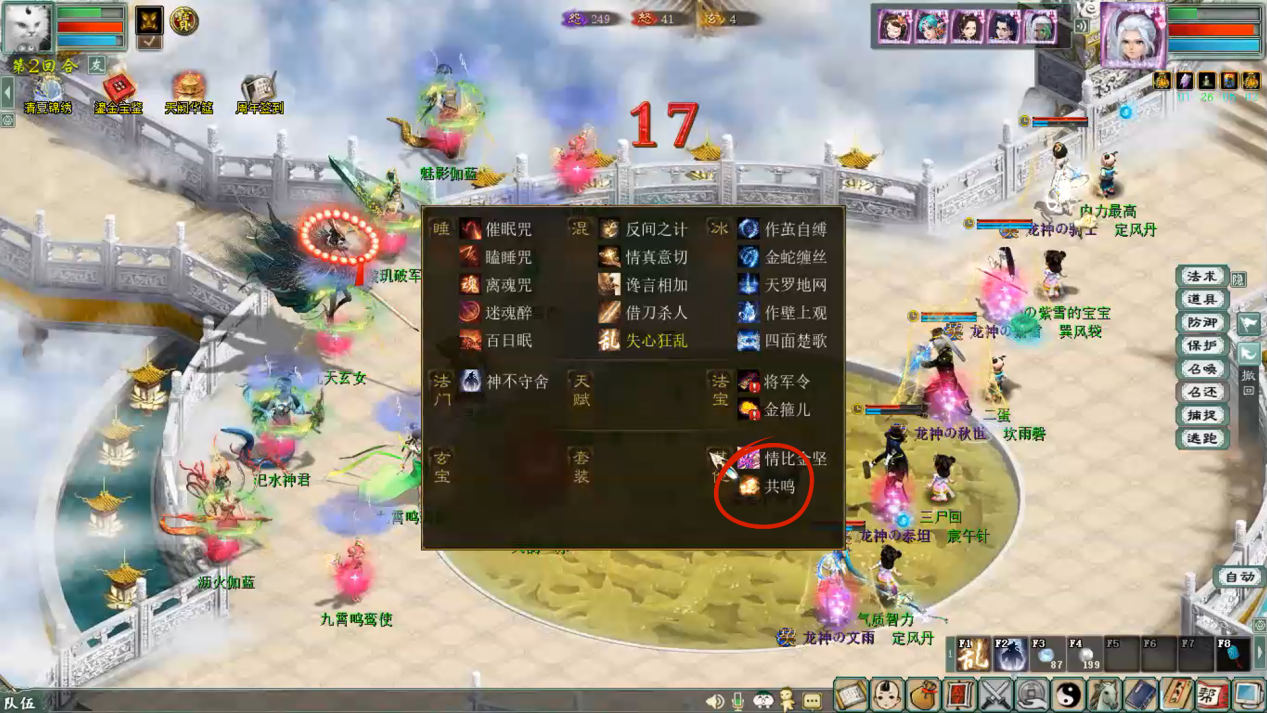 ∷灵韵出现后,当前回合少侠们点击法术界面【共鸣】可吸取该灵韵的加持效果。当某一个玩家共鸣某个灵韵后后其他玩家无法再共鸣该灵韵,因此建议少侠们商讨好。