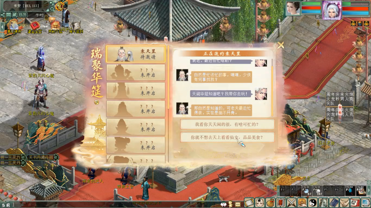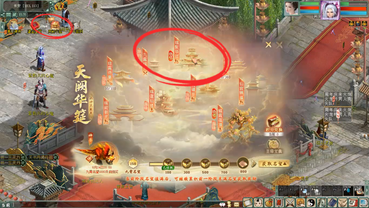 活动时间: 2025年8月7日10:00到2025年8月10日23:59 2025年8月14日00:00到2025年8月17日23:59 2025年8月21日00:00到2025年8月24日23:59 活动攻略: 1.活动开始后,可通过游戏界面【天阙华筳】打开进入【瑞聚华筳】活动后,会自动寻路至太白金星处开启玩法。