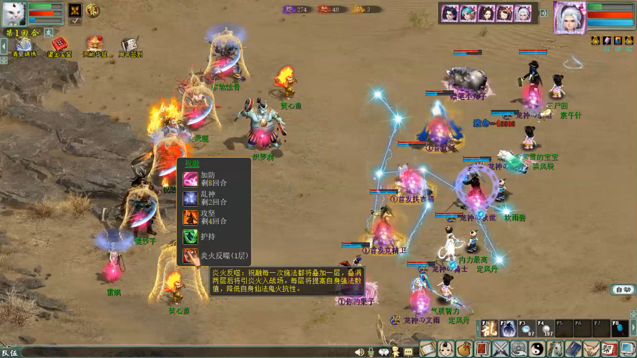 ∷被烬瘟火灵传染的这两个单位,具有一个烬瘟效果,下回合将遭受极大的伤害。而这两只单位恰好是高气血,造成的气血量极高。