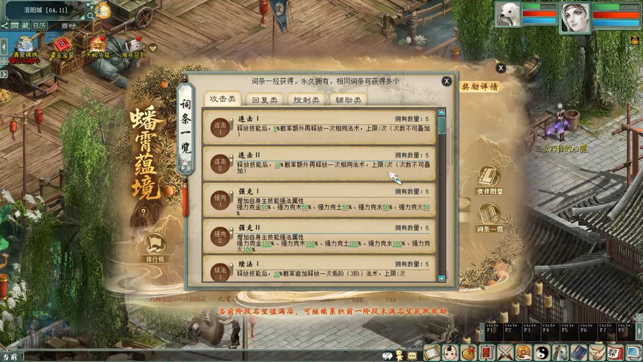 二、伙伴介绍 1.蟠霄蕴境伙伴可通过完成其他周年庆活动获得,我们打开主界面的【伙伴图鉴】查看每个伙伴的信息。每个伙伴具有一个专属技能,其中攻击类包括仙法、霹雳、物功、鬼火、震慑及毒法等,回复类包括三尸和甘霖,控制类只有混乱,辅助类包括牛法、魔盘、鬼盘和五行克。每个小伙伴还有一个被动技能,比如桃小淘会降低敌方仙法鬼火抗性等。