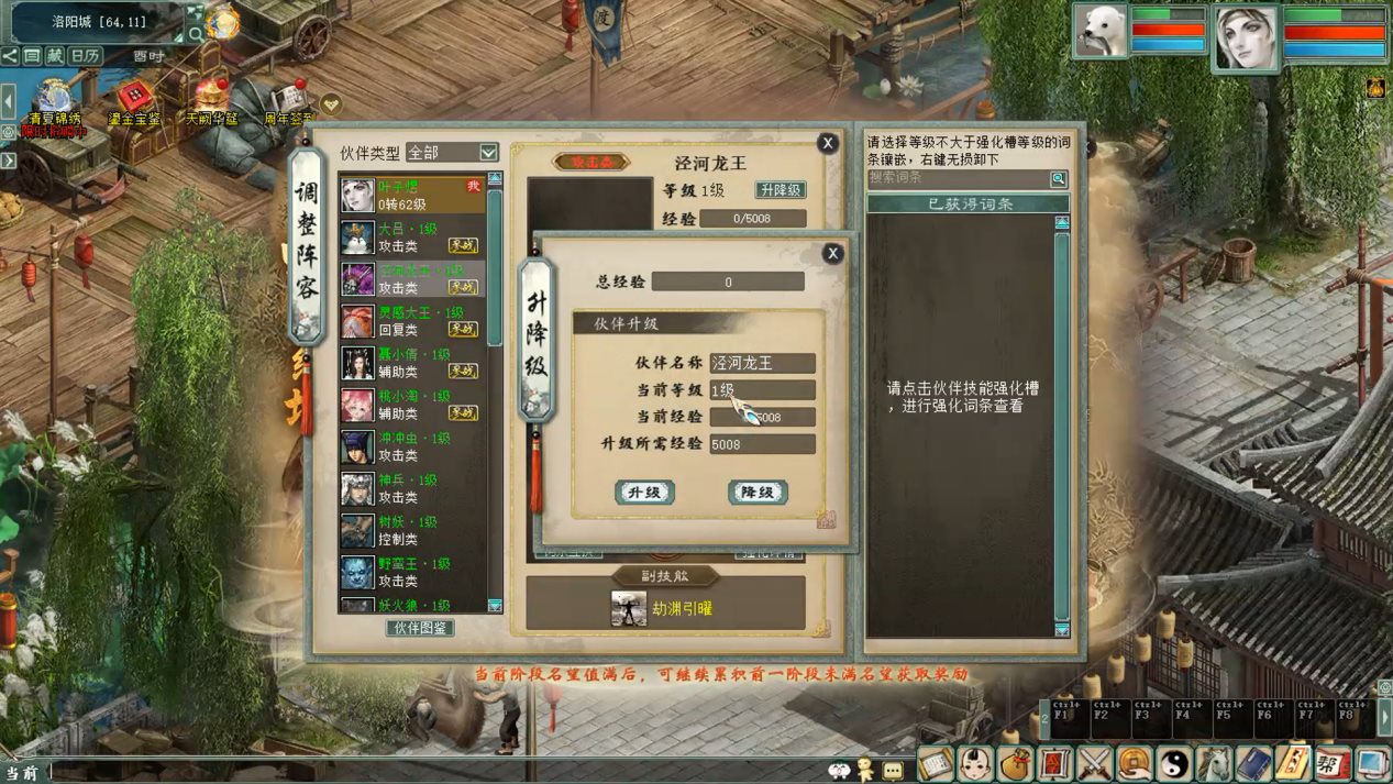 4.倘若少侠们前期携带伙伴升级后,需要调整伙伴搭配选择其他伙伴上场时,此时可以用到一个功能【升降级】。可以点击具有等级和经验的伙伴经验进行【降级】,经验会储存在经验池中,再点击新上场的伙伴进行升级即可。该功能促进伙伴之间的灵活搭配,不用为新伙伴等级低而烦恼!