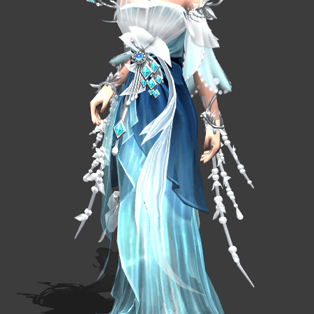 腰间点缀的蔚蓝宝石宛若澄澈的苍穹之眼,其下错落垂着数枚菱形晶石与莹润珍珠,摇曳间仿佛一道凝固的微缩星河,熠熠生辉。胸前独特的云形剪裁与双腕垂下的银线星辉点缀,更添几分空灵与圣洁,完美展现了“手摘星辰,心纳苍穹”的绝美意境。