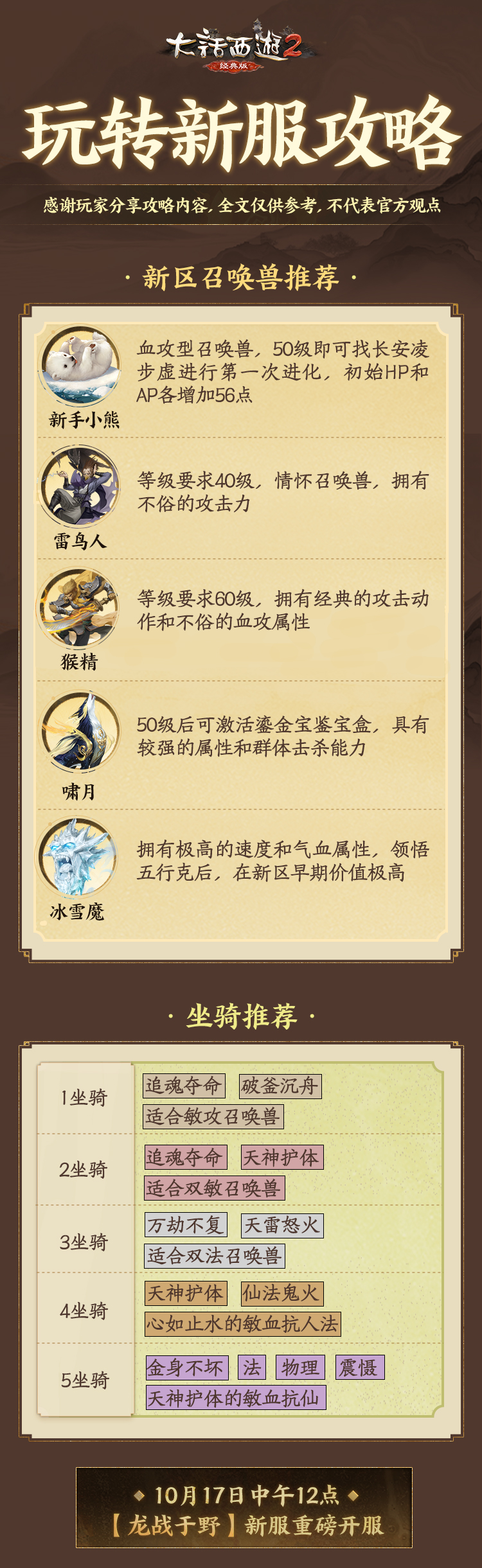 最后,恭喜少侠成长为大侠了!除了冲级技巧,还为少侠准备了新区召唤兽推荐及坐骑推荐,希望能帮少侠更快地在新服站稳脚跟,享受大话江湖乐趣!