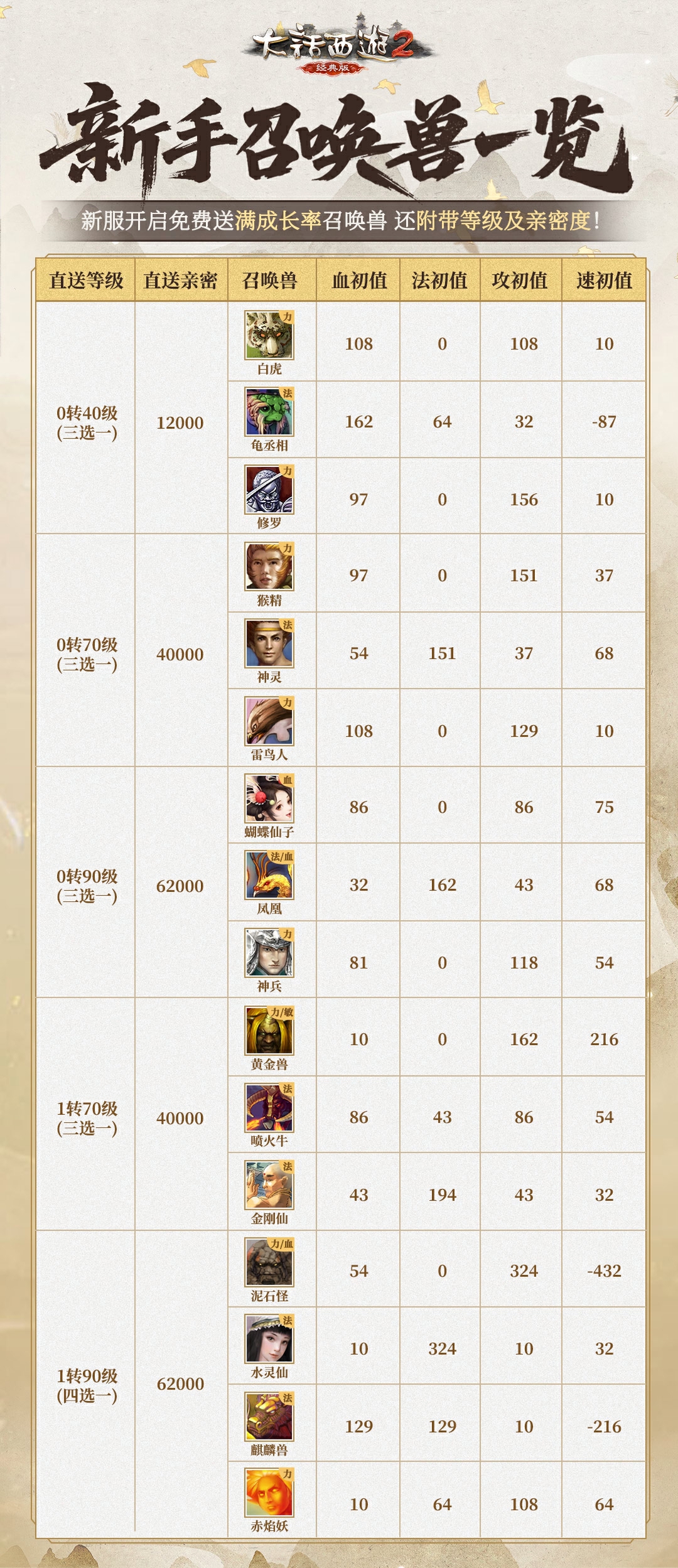 新手召唤兽附带等级和亲密,召唤兽的等级与礼包领取等级一致,并附带等于该召唤兽升到当前等级所应当获得的亲密度。