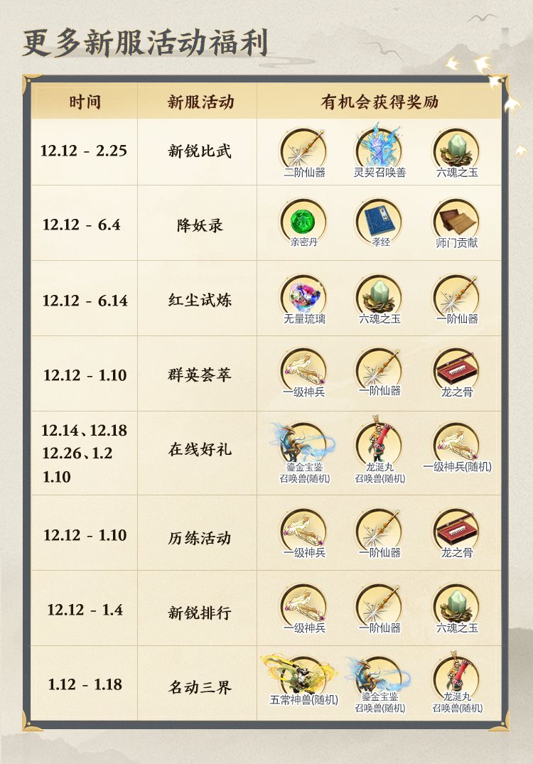 开服第1~8天内会开启新服专属活动“仙缘盛会”,带来六大丰富玩法。少侠参与活动即有机会赢取一级神兵、一阶仙器、龙之骨、筋骨提气丸等好礼,若时间宠等级未到10级只能获得经验奖励,无法获得物品奖励。