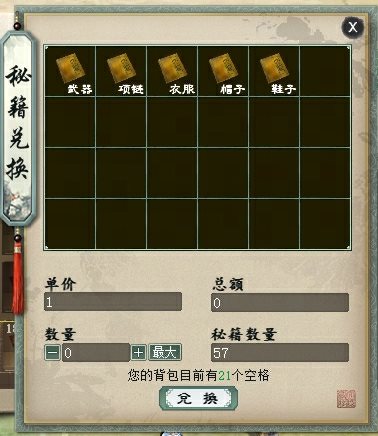 为优化新服体验,现将预约礼包的随机作坊秘籍改为自选秘籍,少侠可在领取时选择任意部位(武器、项链、衣服、帽子、鞋子)的作坊秘籍,熟练度在5000至40000之间随机(第1至4周的作坊秘籍熟练度依次增加),固定500成就。