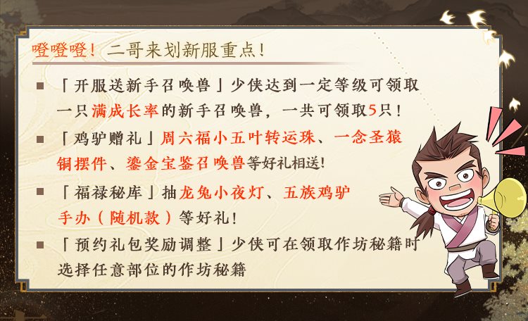 新服预约开启~开服第31天23:59通过进行指定玩法消费多宝、多福仙玉,累计“鸡驴赠礼”积分进行抽奖,有机会抽取周六福小五叶转运珠、一念圣猿铜摆件、大吕蓝牙音响、鎏金宝鉴召唤兽(随机)等好礼。