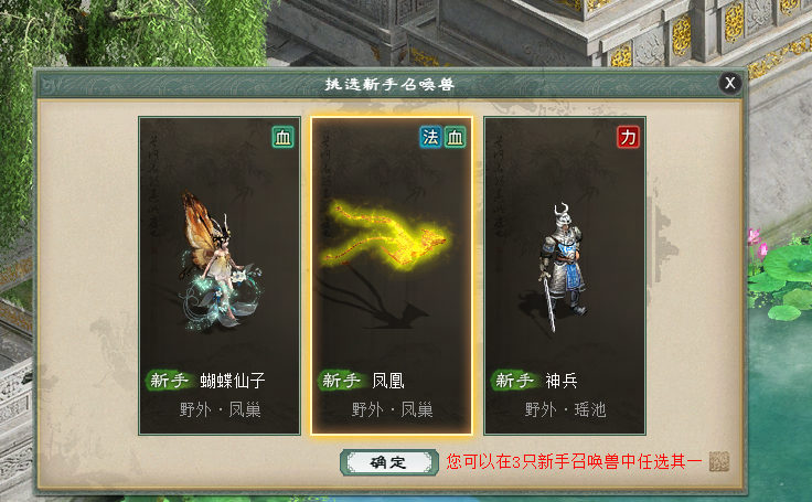 少侠达到一定等级后可在“开服狂欢-等级礼包”或“历练锦囊”中领取一只满成长率的新手召唤兽,一共可领取5只新手召唤兽。