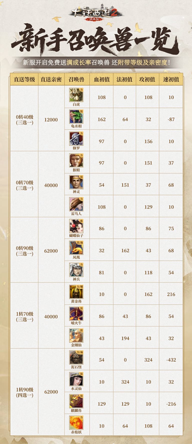 当少侠达到0转40级、0转70级、0转90级、1转70级、一转90级时,可分别在“开服狂欢-等级礼包”或“历练锦囊”中选择一只满成长率的新手召唤兽领取,一共可领取5只新手召唤兽,大家可以根据自己的需求进行选择!