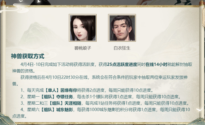 本帖最后由 夏鸾忆。 于 2022-4-18 11:46 编辑 鎏金岁月怀旧——神秘绝版神兽返场,你最期待哪个?在鎏金岁月怀旧活动中,将有多个神秘神兽再度现身大话江湖!除了已经解锁的碧桃娘子、白衣狂生、点朱美人、绛云仙 ...