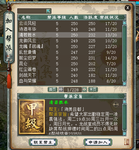 后来合区,服务器一下子热闹了起来,有人开始往我们服务器移民。我看准了这个时机,开始努力为清若胜水招人。只要看到系统提示有人来了,我就私聊他,拉他加入我们帮派。 我们小帮派,其实发展挺难的,但是我相信,只要我勤快点,总有愿意一起发展的玩家,我就用这样的方式,大概前前后后用了两个月左右的时间,拉了不少的兄弟姐妹过来,所以帮派在整体实力上也还算不错。