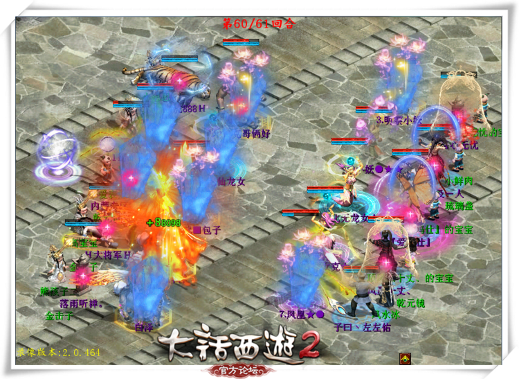 60回合, 爱马仕和 天下不及一人同时开启 流风回雪, 左左佑一个大冰封印了 石头蛋蛋队站立的6个单位 大将军的白泽 法术躲闪幸免于难,随后 吾心无忧一炮放倒白泽  可不凑巧的是白泽并没有就此离场,而是触发了 涅槃再次复活  一个小绝境救起了倒地的 老虎888、大将军、落雨听禅。