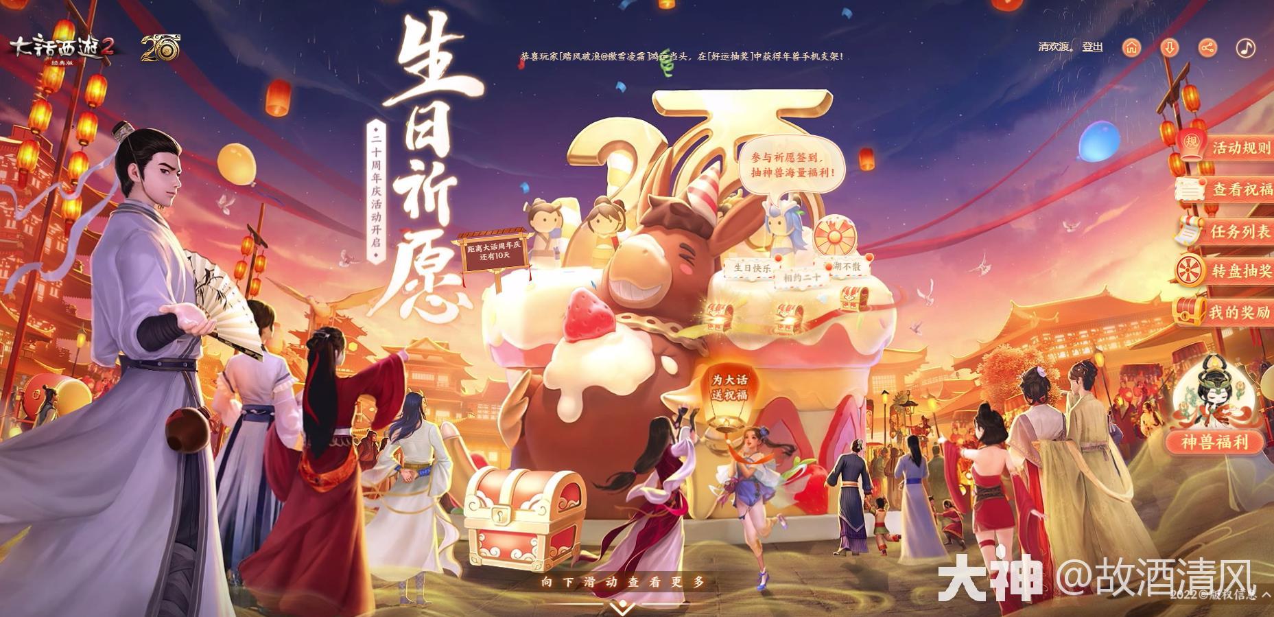 一款游戏一生朋友,大家好,我是故酒清风,大话西游20岁啦,周年庆很多任务也已经开放了,相信小伙伴们也都已经体验过了,运气好的,神兽神兵也都拿到手了,任务比较繁琐,但是奖励还是比较不错的! 然而,还有一个活动或许大家忽略了,那就是生日祈愿活动,这个活动每天就是签到一下,然后把周年庆的任务做了,给相对应的祈愿值,然后去祈愿就有几率得仙器、神兵、神兽哦! 那清风就在这里给大家详细的讲一下这个任务应该怎么做,有什么需要注意的!