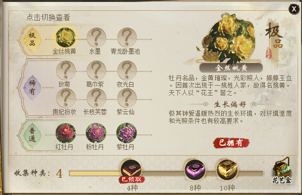 最后再提醒一下各位,手里材料不多的时候,种普通类的牡丹就可以,啥也不用放,每天一次,种出来的普通牡丹还可以兑换经验和随机的物品奖励
