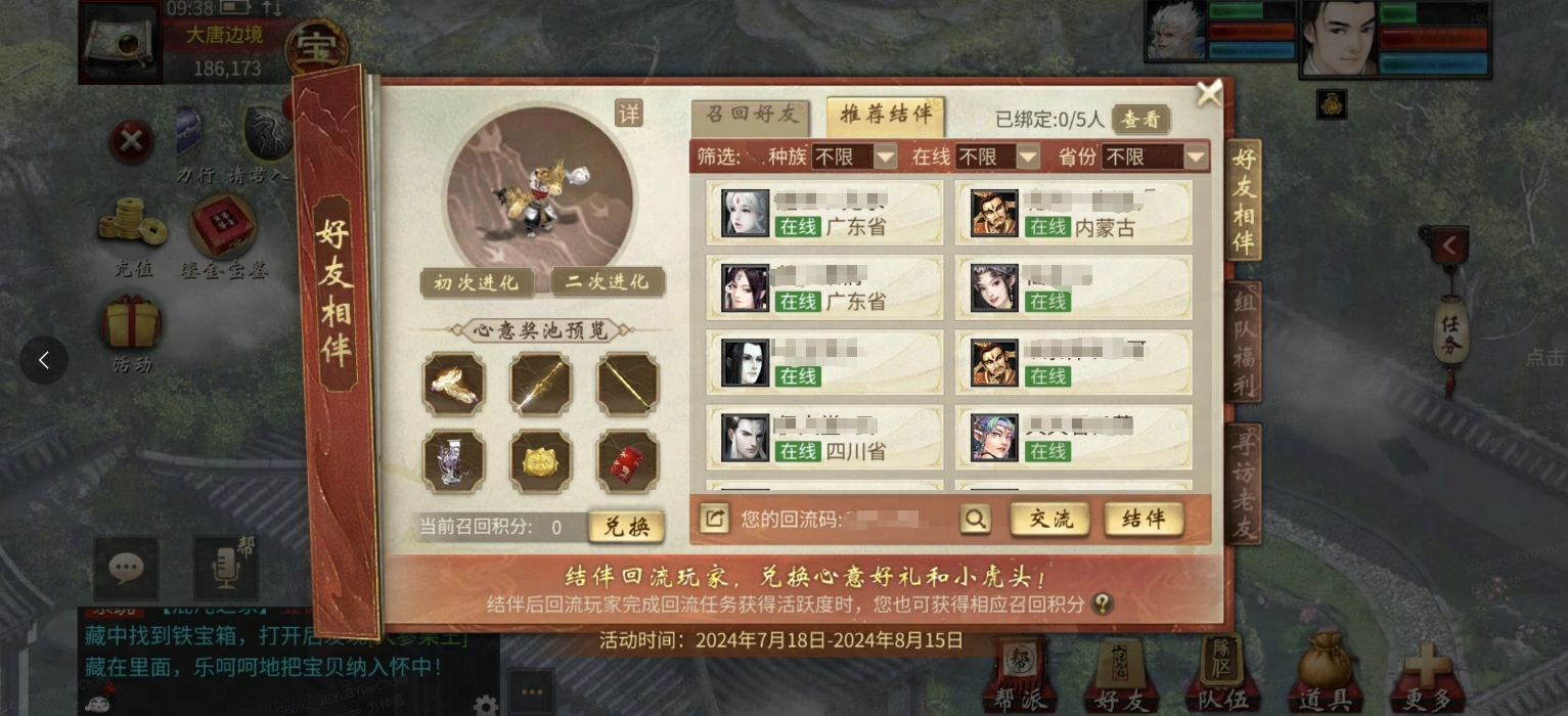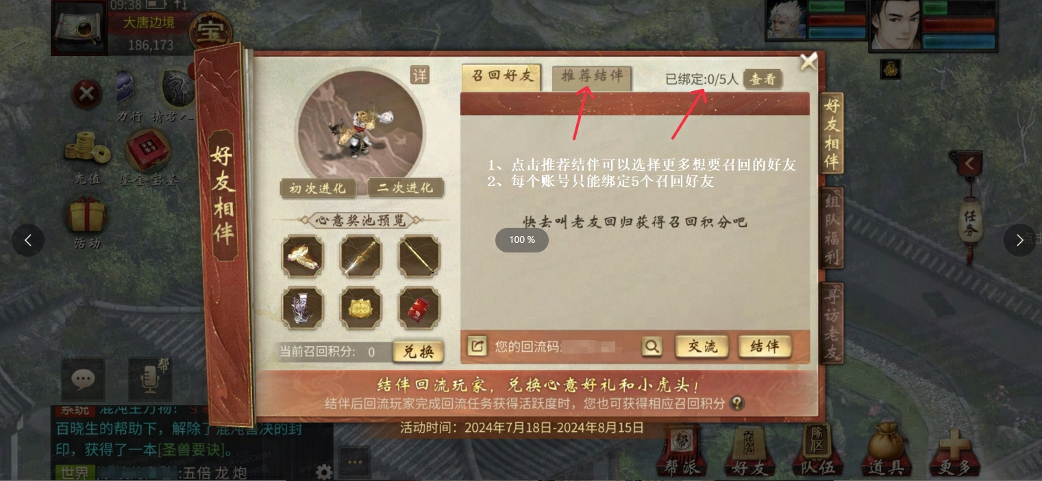 老铁们找到回流玩家后,可以通过游戏外接触,游戏内私聊等方式将自己的回流码告诉老友并邀请其进行绑定结伴(最多五个回流玩家绑定你的码)