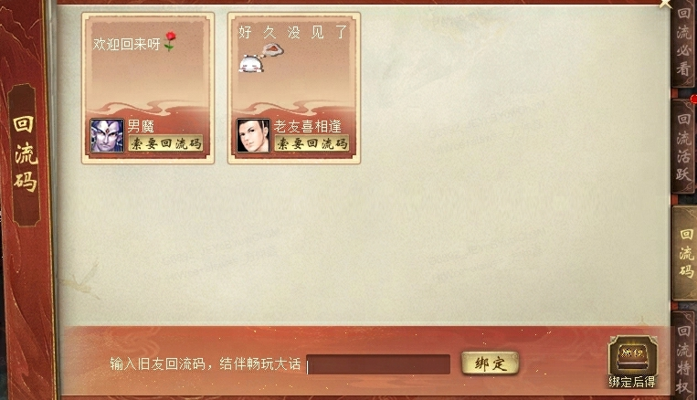 (回流玩家点击左上角老友重逢按钮后回流码页面绑定)
