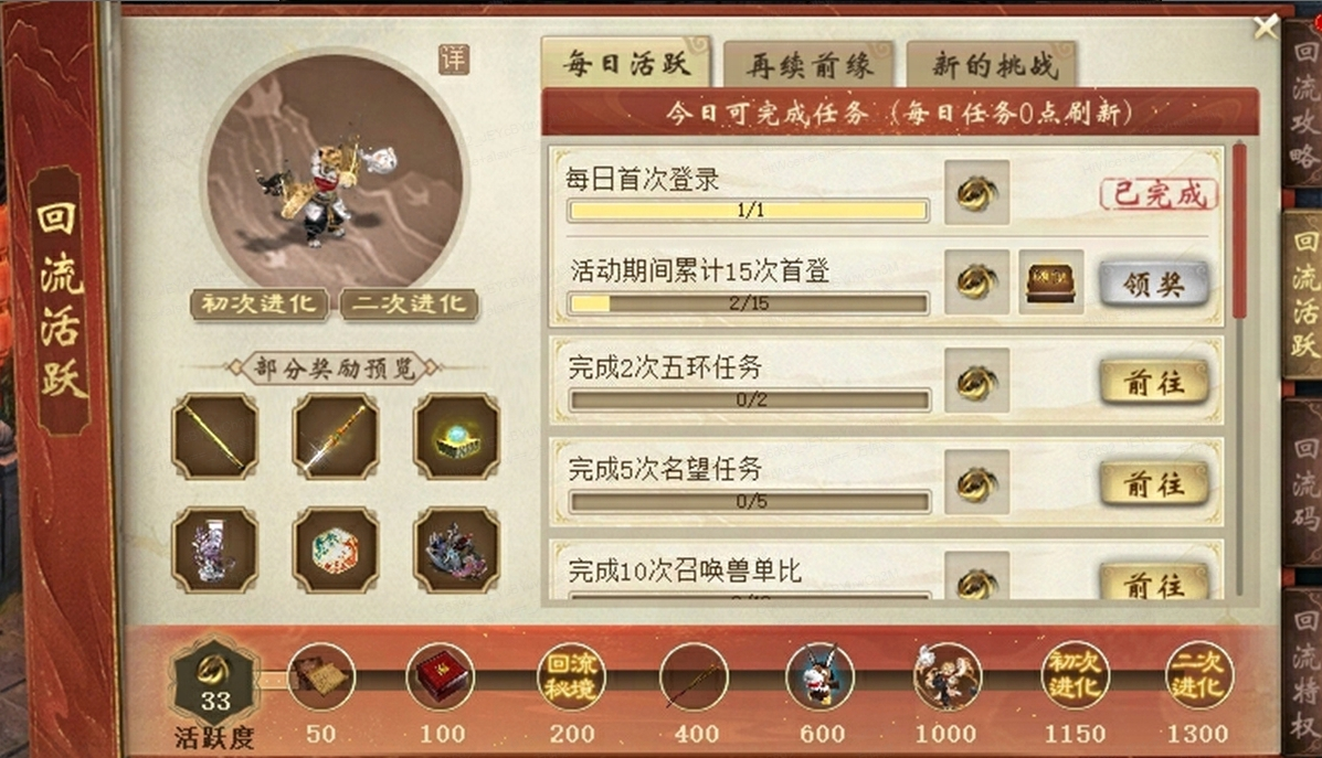 游戏内点击左上角“老友重逢”按钮打开活动界面,可点击回流活跃度标签查看