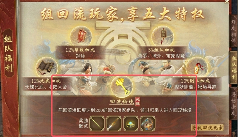 与回归玩家一起组队可全员可享受回归buff加成、帮战、修罗、域外比武等活动