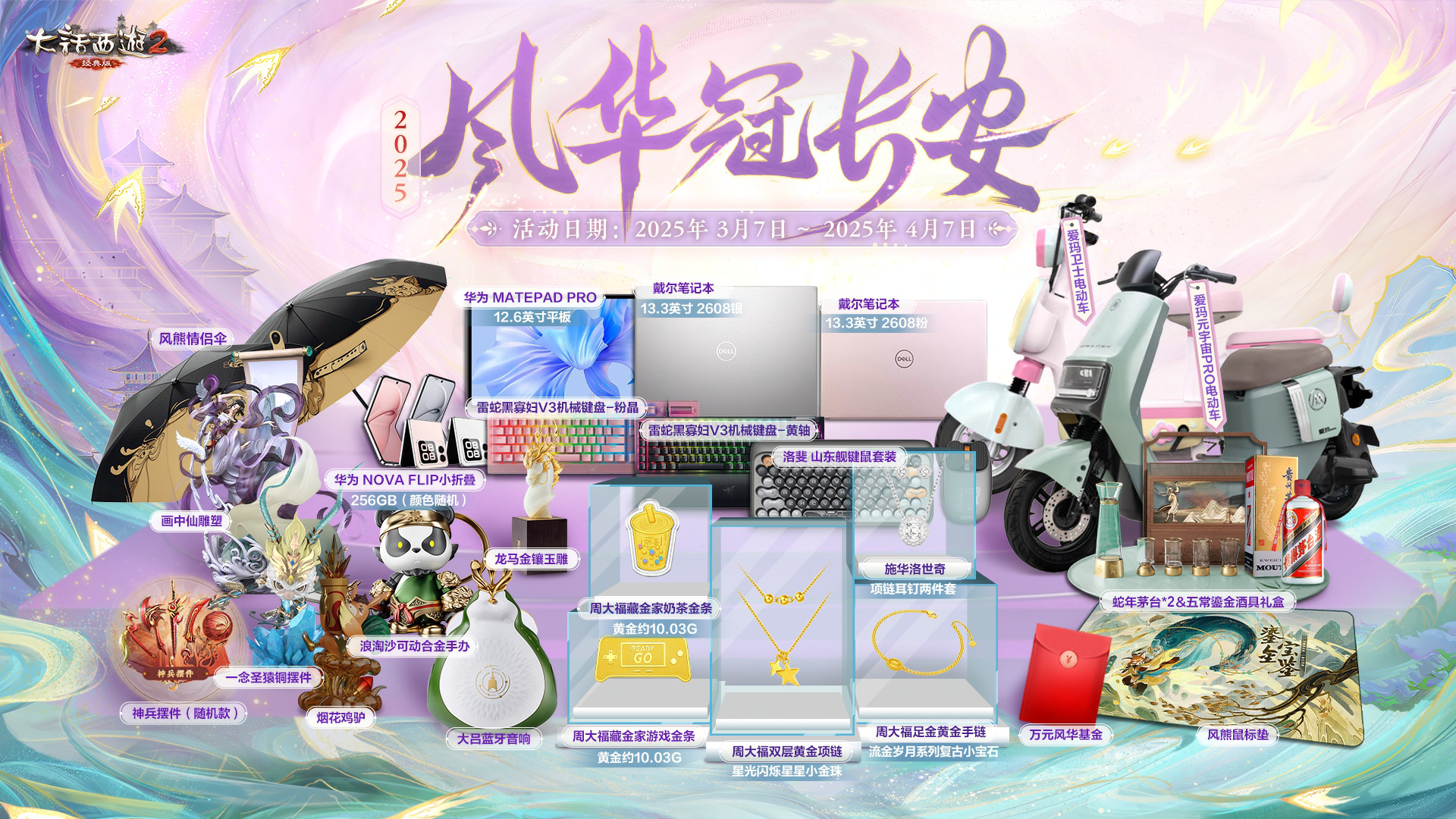 多重福利,尽情挥洒风采 本次【风华冠长安】活动,我们为参赛者精心准备了万元风华基金,更有定制奖杯、周大福系列黄金金条、黄金手链、黄金项链、蛇年茅台、戴尔笔记本、华为手机、华为平板、爱玛电动车等豪华实物大礼等你赢取!此外,专属游戏称谓、专属游戏勋章、专属游戏冒泡框、专属游戏铃铛等游戏内道具奖励也一应俱全,让你的荣耀在游戏中尽情绽放! 奖励详情如下: 相关奖励 | 周大福藏金家奶茶黄金金条约10.03g+5000元风华基金+定制奖杯 | 周大福藏金家游戏黄金金条约10.03g+5000元风华基金+定制奖杯 | 周大福流金岁月系列复古小宝石足金黄金手链+3000元风华基金+定制奖杯 | 蛇年茅台*2&五常鎏金酒具礼盒+3000元风华基金+定制奖杯 | 周大福星光闪烁星星小金珠双层黄金项链+1000元风华基金+定制奖杯 | 华为MatePad Pro 12.6英寸平板+1000元风华基金+定制奖杯 | 戴尔 13.3英寸笔记本(颜色随机) | 华为 nova Flip小折叠 256GB(颜色随机) | 爱玛元宇宙Pro电动车 | 爱玛卫士电动车 | 施华洛世奇 项链耳钉两件套 | 雷蛇黑寡妇V3机械键盘 | 专属游戏称谓、游戏勋章、游戏冒泡框、游戏铃铛 |